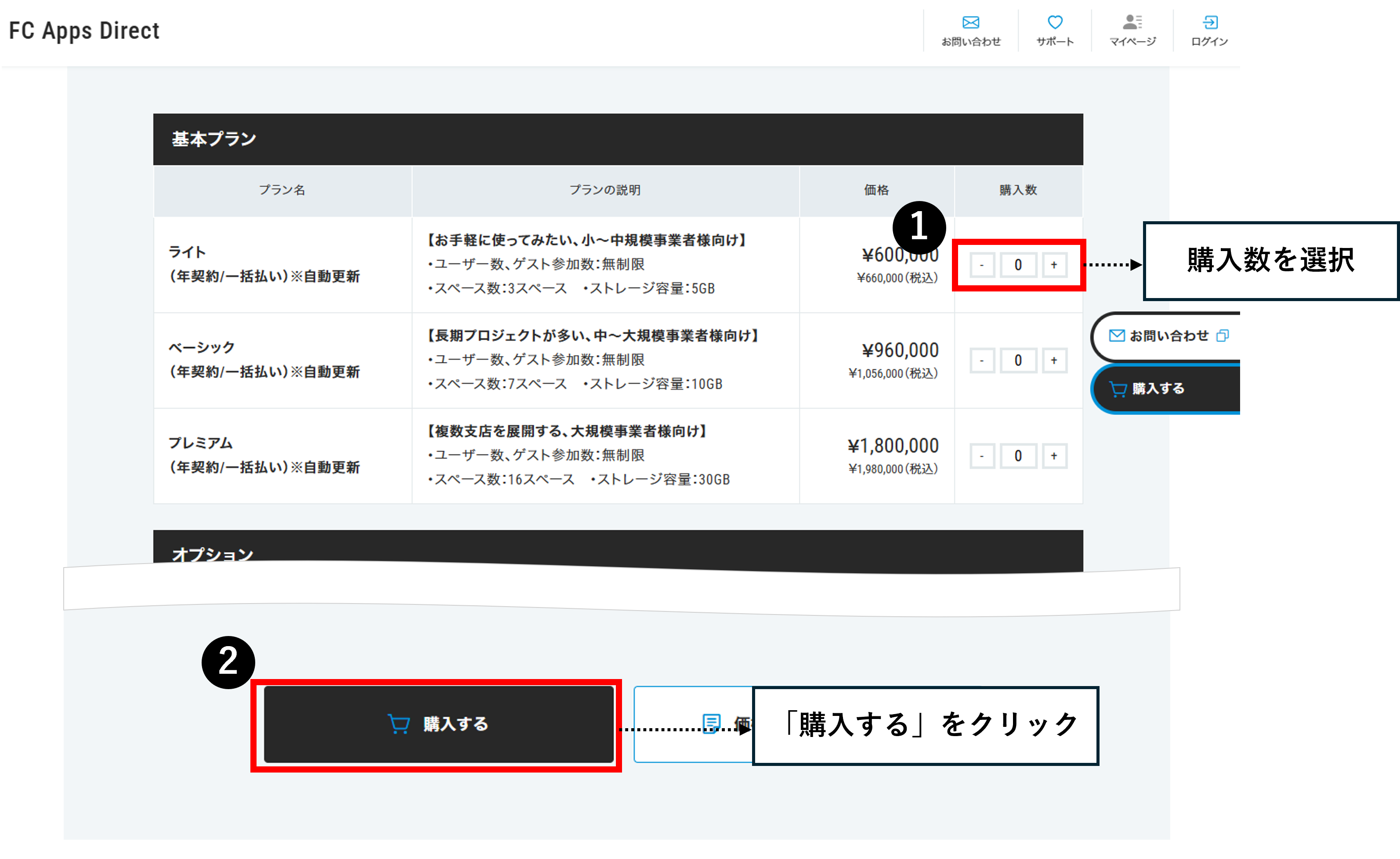 製品ページに購入プラン掲載ている製品は、FC Apps Directでオンライン購入が可能です。