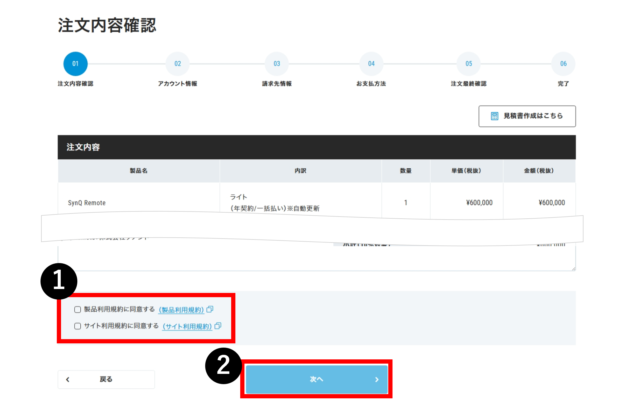 注文内容を確認し、製品利用規約とサイト利用規約の「同意する」にチェックを入れて「次へ」をクリックします。
