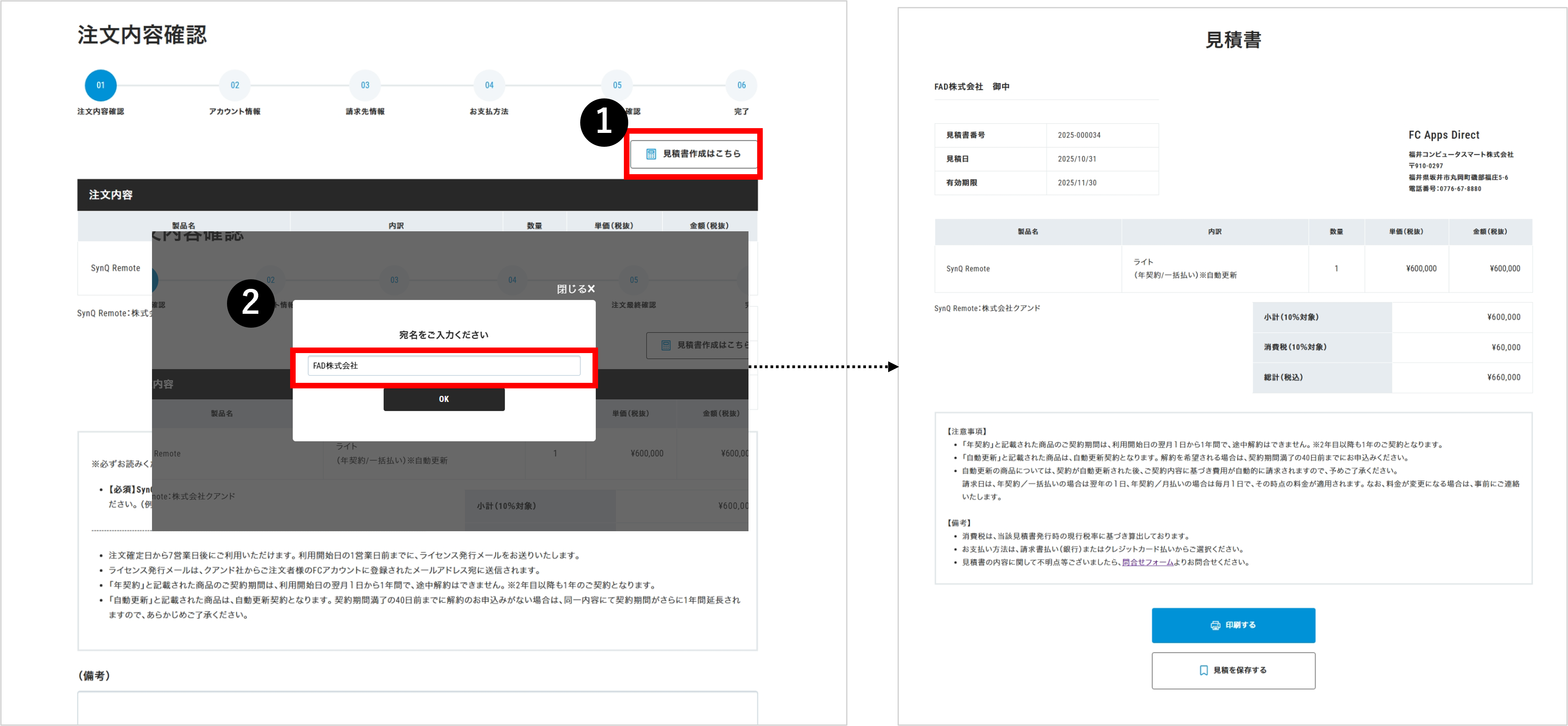 保存した見積書は、マイページから印刷や見積書の内容で購入手続きが行えます。操作方法はこちら