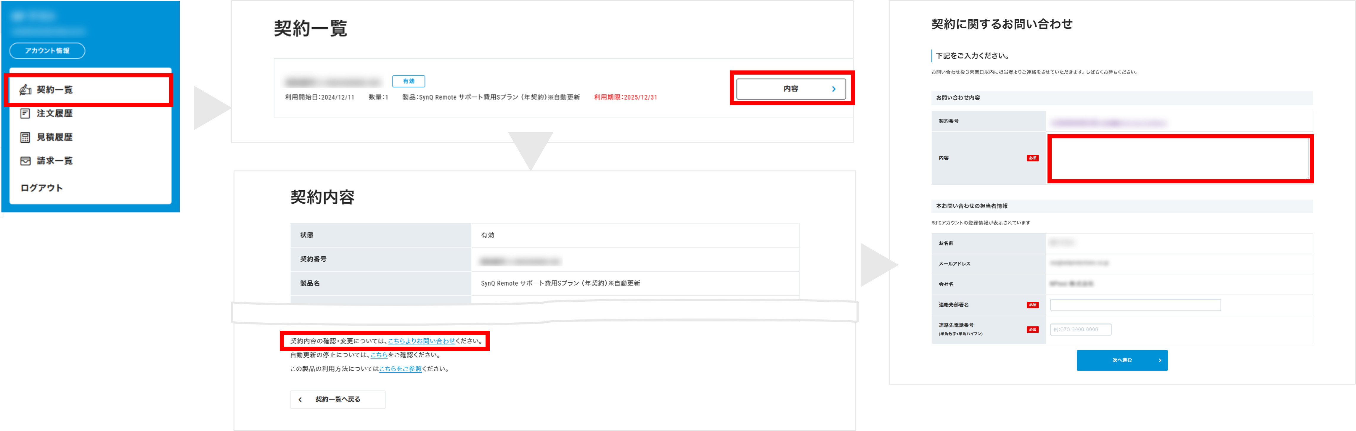 - 「契約に関するお問い合わせ」フォームが開きますので、「内容」に契約変更または解約について表記し、送信します。