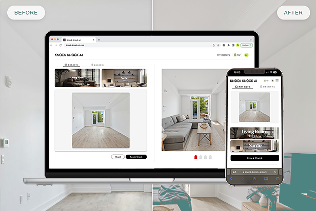CADで作成したパースやカメラで撮影した内観写真に対して、AIが家具や小物を自動で配置できるサービスです。