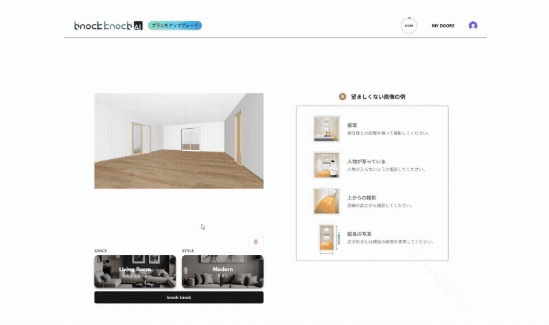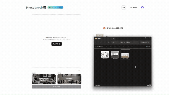 先ほど作った内観パースをPNG形式で出力しました。これを、knock knock AIにアップロードします。保存先のフォルダからドラッグ&ドロップという一般的な操作でアップロードできますし、望ましくない画像の例も載っていて、どんな画像を用意すると良いもわかりやすく、どなたでも使えるなという印象です。