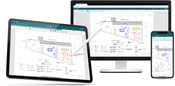 複数人が同じ図面に同時に書き込みしても、反映が速く、指示の共有が滞りません。現場・設計・協力会社とのリモート打合せでもストレスなく利用できます。 - レイヤー機能による情報整理