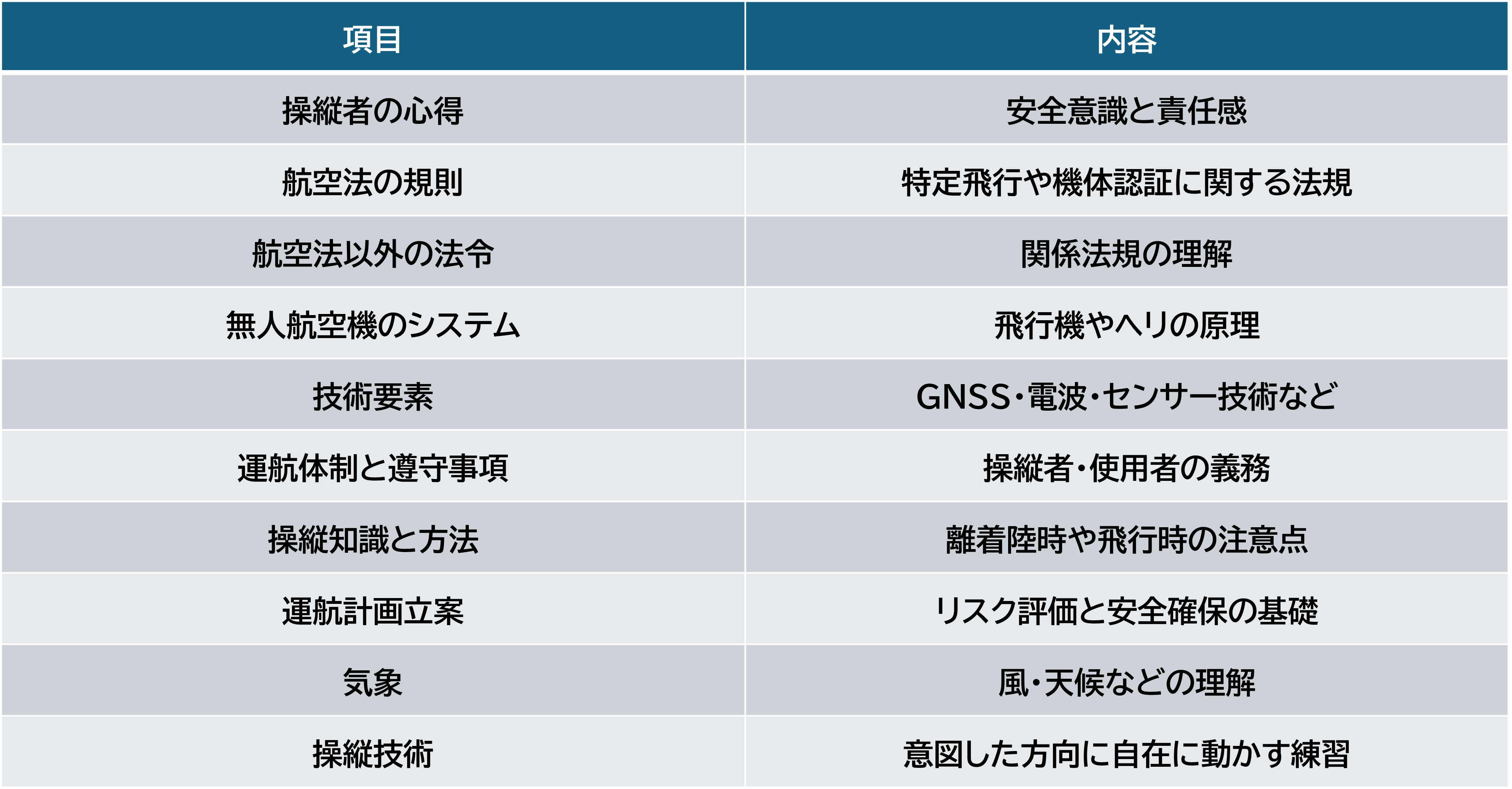 講師の立場から見ても、国家資格講習は内容が非常に幅広く、難易度も高いものです。空を飛ぶ機体を扱う以上、安全性を確保するための知識体系は複雑になります。講習では次のような内容を学びます。