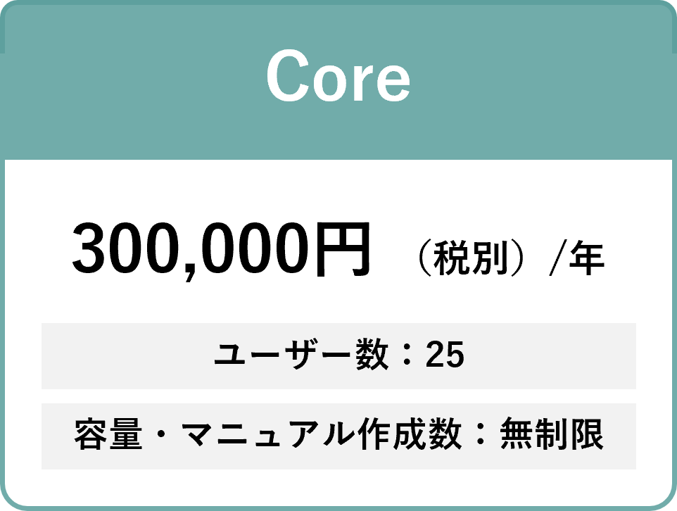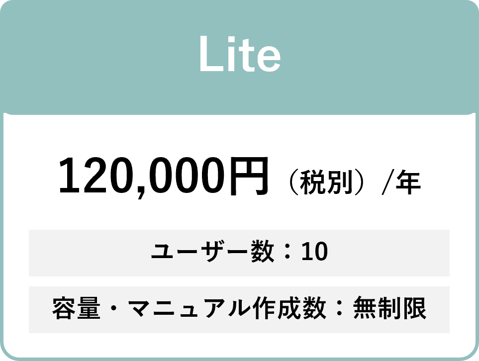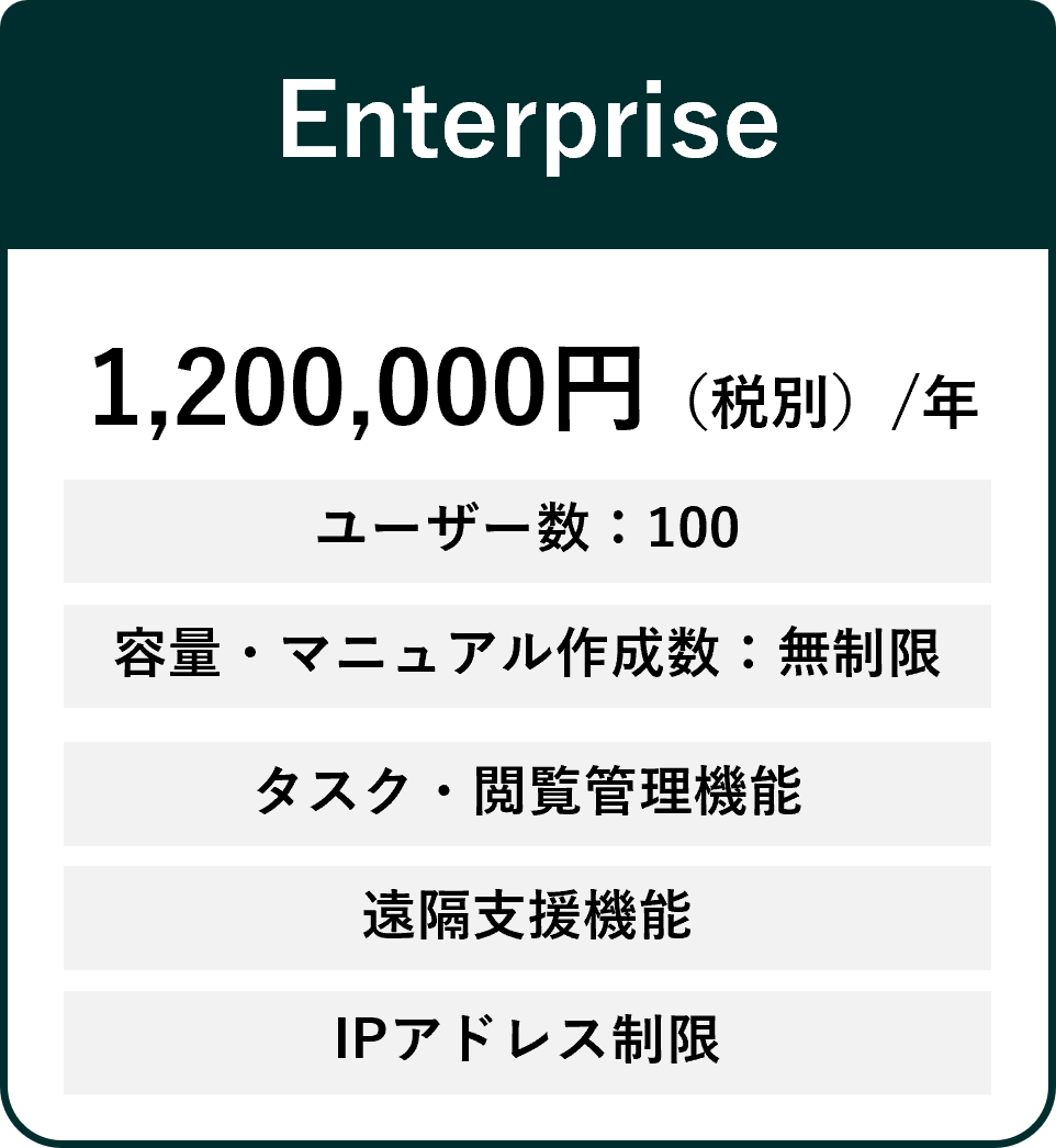 【遠隔支援やセキュリティ重視の大規模事業者様向け】・Proに加えて、遠隔支援やIPアドレスの制限ができます。・ユーザー数上限:100・容量、マニュアル作成数:無制限