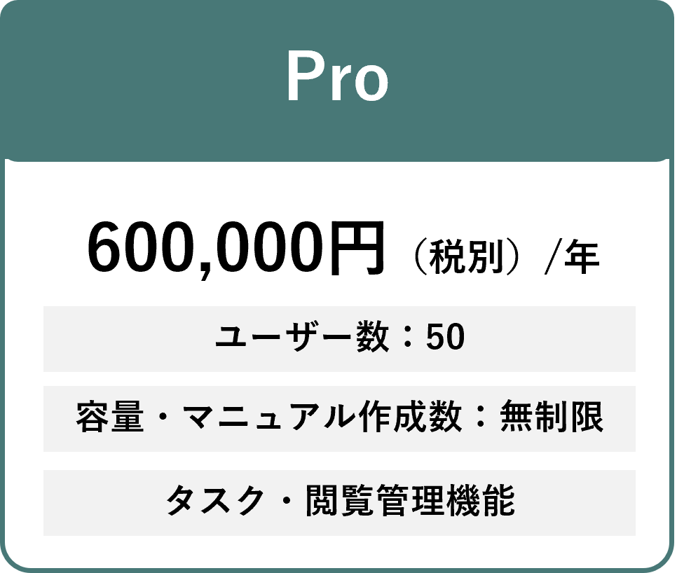 【作業結果を管理したい中~大規模事業者様向け】・Entryに加えて、タスクや閲覧履歴の管理ができます。・ユーザー数上限:50・容量、マニュアル作成数:無制限