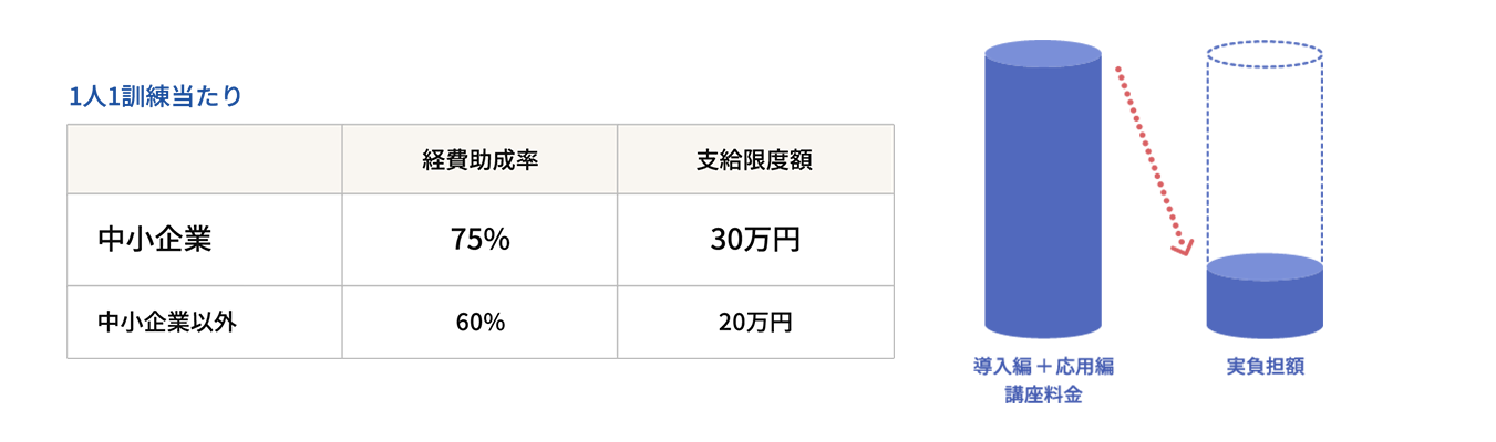 厚生労働省が令和4年~8年度の期間限定の助成金として創設した人材開発支援助成金「事業展開等リスキリング支援コース」の活用講座受講後に助成金を申請して審査が通り、助成金交付がされた場合には、負担が実質的には最小限になります。参考:厚生労働省「人材開発支援助成金」※助成金は必ず交付されるものではありません。詳細は社会保険労務士にご確認ください。