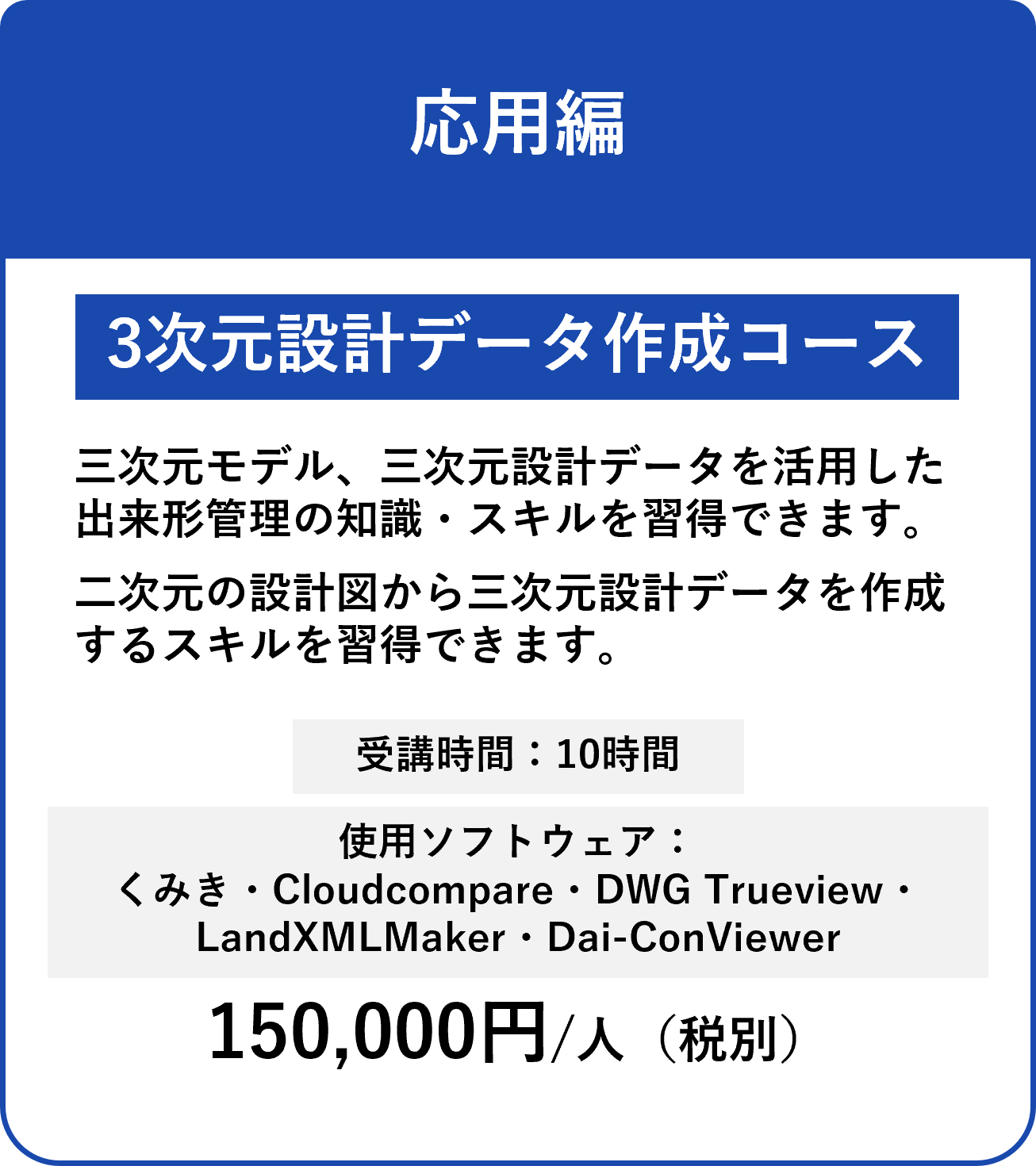 導入編、応用編(2コース)をご用意しています。「導入編を受講してから応用編を受講するか決めたい」「点群処理演習徹底コースだけ受講したい」など、ご希望に応じて各編、コースを自由にお選びいただけます。▶ TREND-POINT、EX-TREND武蔵をご利用の方向けの専用コースもご用意しています。(詳細はこちら)