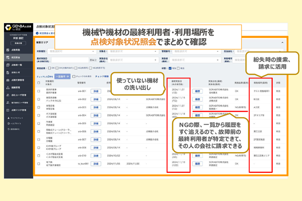 現場にある機械や機材の最終利用者・利用場所が記録でき、まとめて確認、使っていない機械や機材の洗い出し、コストの最適化にも寄与します。