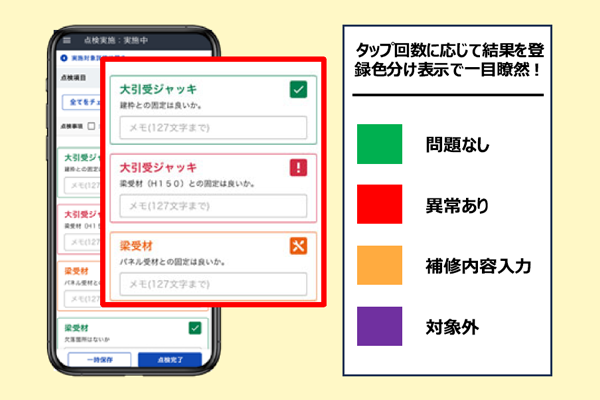 画面もシンプルでマニュアルがなくても直感的に使用でき、点検が楽に。スマホとWebで利用できるので、現場の作業員の方も抵抗なく使用しています。