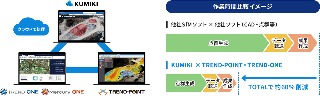 「くみき」で生成された点群やオルソ画像、解析結果をTREND-ONE、TREND-POINTへ直接取込みが可能。SfM処理、点群処理、成果作成業務におけるスムーズなクラウド連携で、ドローン測量業務の作業時間を全体で約60%削減します。