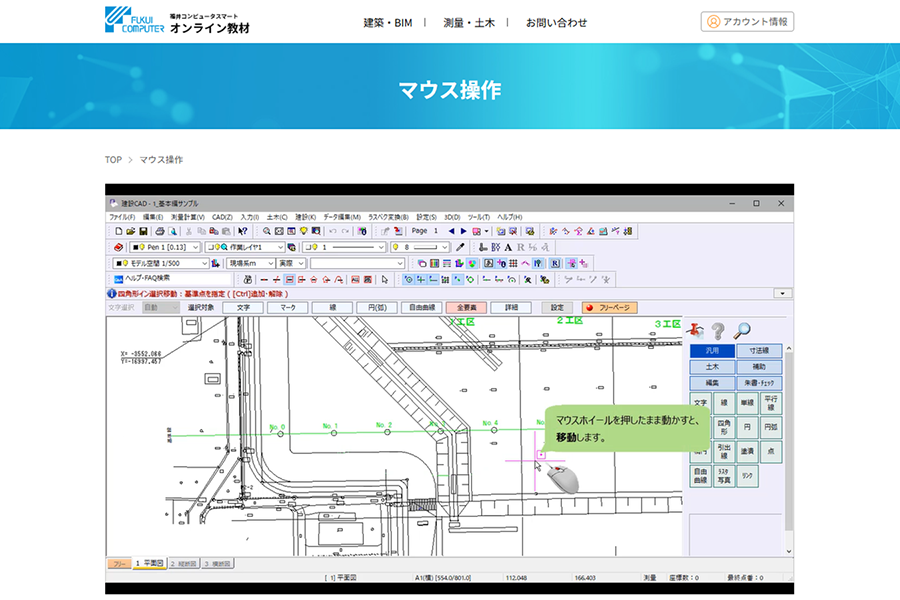 基本編では、建設CADの基本操作や設定をはじめ、作図練習やDXFなどの外部ファイルを読み込む操作を学べます。計算編では、トラバース計算や路線縦横断など、各種土木計算の方法を習得できます。