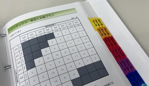 『SELECTED 500PLANS』は、間口と奥行き別に分類された商談向けプラン集です。敷地図にトレーシングペーパーで印刷された間取りプランを重ねて比較でき、初回面談でお客様に最適なプランを提示できます。要望に近いプランを軸に修正するだけで次回のプレゼンもスムーズに行え、競合に差をつけながら契約獲得につなげられます。